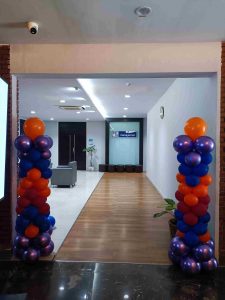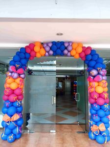 • Lengkungan Balon: Buat lengkungan balon di pintu masuk utama dengan kombinasi warna biru, ungu, orange, dan pink magenta. Lengkungan ini akan memberikan sambutan yang meriah dan megah.